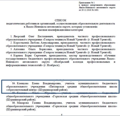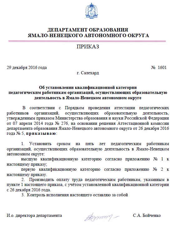 Квалификационная категория: высшая (приказ от 29.12.2016 г. №1601 ДО ЯНАО)