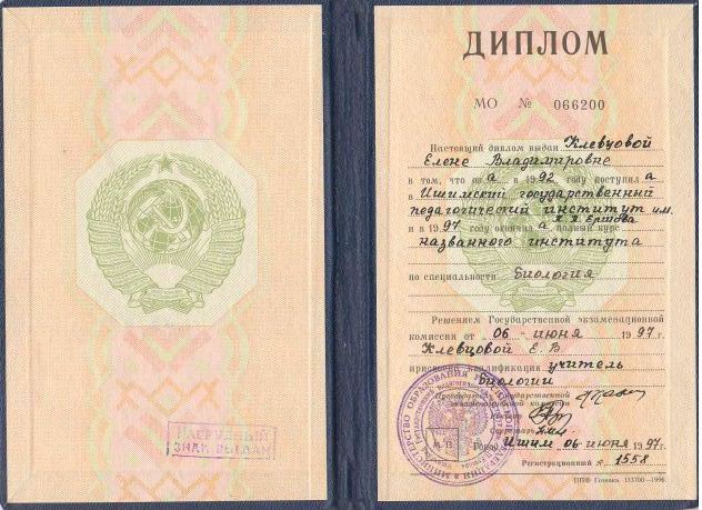 - Ишимский государственный педагогический институт им. П.П. Ершова специальность «Биология», 1997;