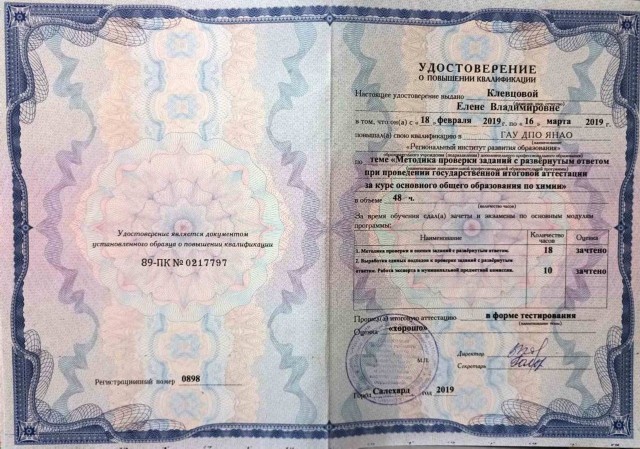 • КПК «Методика проверки заданий с развернутым ответом при проведении государственной итоговой аттестаации по программам основного общего образования по химии», 48 ч., ГАУ ДПО ЯНАО «Региональный институт развития образования», Салехард, февраль-март 2019 г., удостоверение 89-ПК №0217797/0898;