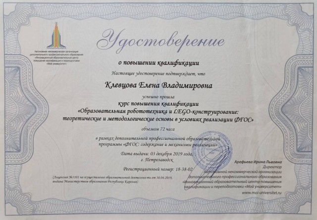 • КПК по дополнительной профессиональной образовательной программе «ФГОС: содержание и механизмы реализации» «Образовательная робототехника и Лего-конструирование: теоретические и методологические основы в условиях реализации ФГОС», 72 ч., АНО ДПО «Инновационный образовательный центр повышения квалификации и переподготовки «Мой университет», Петрозаводск, декабрь 2019 г., удостоверение 18-38-02;