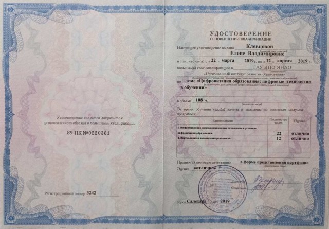 • КПК «Цифровизация образования: цифровые технологии в обучении», 108 ч., ГАУ ДПО ЯНАО «Региональный институт развития образования», Салехард, март-апрель 2019 г., удостоверение 89-ПК №0220361/3242;