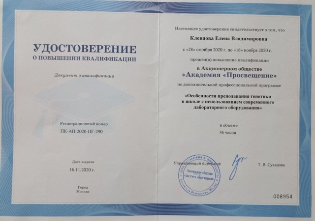 • КПК «Особенности преподавания генетики в школе с использованием современного лабораторного оборудования», 36 ч., АО «Академия «Просвещение», Москва, октябрь 2020 г., удостоверение ПК-АП-2020-ПГ-290/008954;