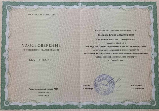 • КПК по дополнительной профессиональной программе «ИКТ-компетентность педагога дополнительного образования как требование профессионального стандарта», 72 ч., АНОО ДПО Академия образования для взрослых «Альтернатива», Киров, октябрь 2020 г., удостоверение 4327 00 23511;