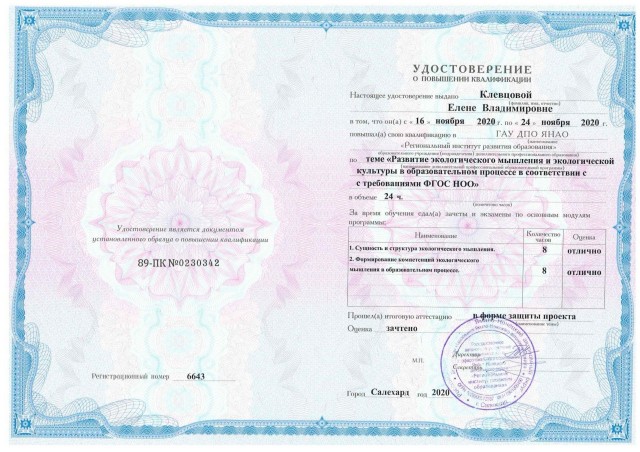 • КПК «Развитие экологического мышления и экологической культуры в образовательном процессе в соответствии с требованиями ФГОС НОО», 24 ч., ГАУ ДПО ЯНАО «Региональный институт развития образования», Салехард, ноябрь 2020 г., удостоверение 89-ПК №0230342/6643;