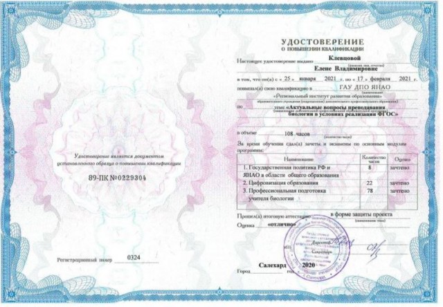 • КПК «Актуальные вопросы преподавания биологии в условиях реализации ФГОС», 108 ч., ГАУ ДПО ЯНАО «Региональный институт развития образования», Салехард, январь-февраль 2021 г., удостоверение 89-ПК №0229304/0324;
