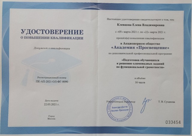 • КПК по дополнительной профессиональной программе «Подготовка к решению олимпиадных заданий по функциональной грамотности», 16 ч., АО «Академия «Просвещение», Москва, март 2021 г., удостоверение ПК-АП-2021-ОЛ-ФГ-0090/033454