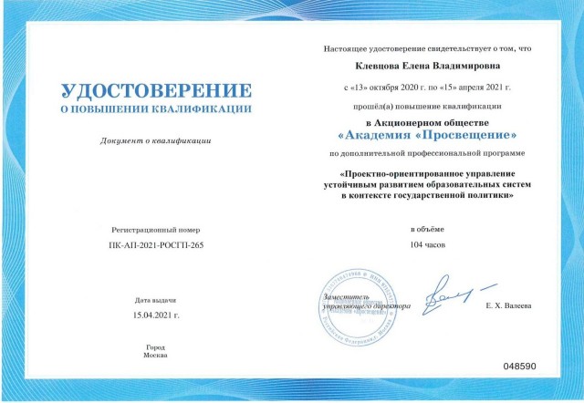 • КПК по дополнительной профессиональной программе «Проектно-ориентированное управление устойчивым развитием образовательных систем в контексте государственной политики», 104 ч., АО «Академия «Просвещение», Москва, апрель 2021 г., удостоверение ПК-АП-2021-РОСГП-265/048590;