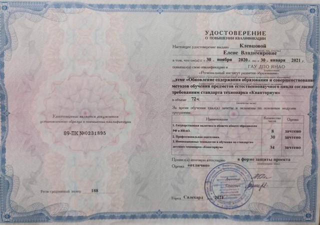 • КПК «Обновление содержания образования и совершенствование методов ообучения предметов естественно-научного цикла согласно требованиям стандарта технопарка «Кванториум», 72 ч., ГАУ ДПО ЯНАО «Региональный институт развития образования», Салехард, ноябрь 2020 – январь 2021 г., удостоверение 89-ПК №0231895/188;