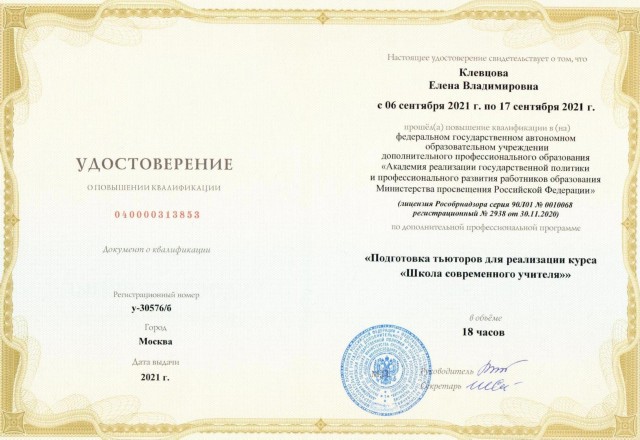 КПК "Подготовка тьюторов для реализации курса "Школа современного учителя", 18 ч., ФГАОУ ДПО "Академия реализации государственной политики и профессионального развития работников образования Министерства просвещения Российской федерации, Москва, 2021, № 040000313853