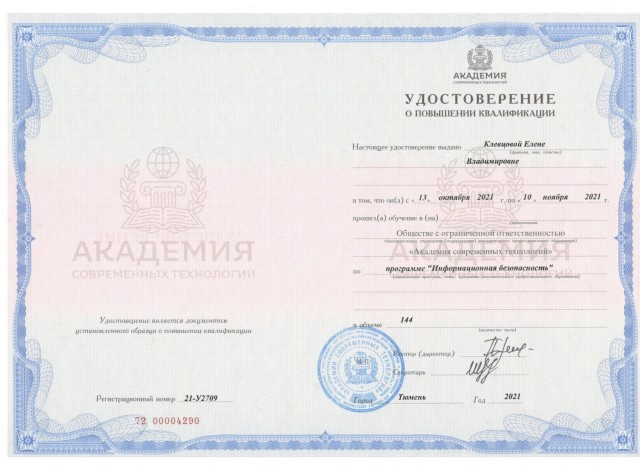 КПК «Информационная безопасность», 144 ч., октябрь-ноябрь 2021 г. Общество с ограниченной ответственностью «Академия современных технологий», Тюмень