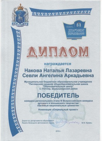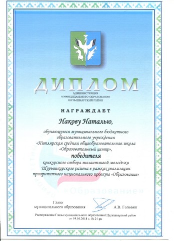 Победитель конкурсного отбора талантливой молодежи МО Шурышкарский район |