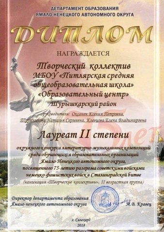 Окружной конкурс литературно-музыкальных композиций среди обучающихся ОО ЯНАО, посвященного 75-летию разгрома советскими войсками немецко-фашистских войск в Сталинградской битве, 2018 |